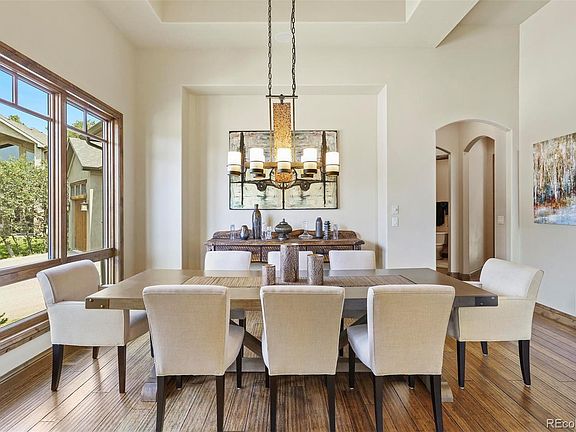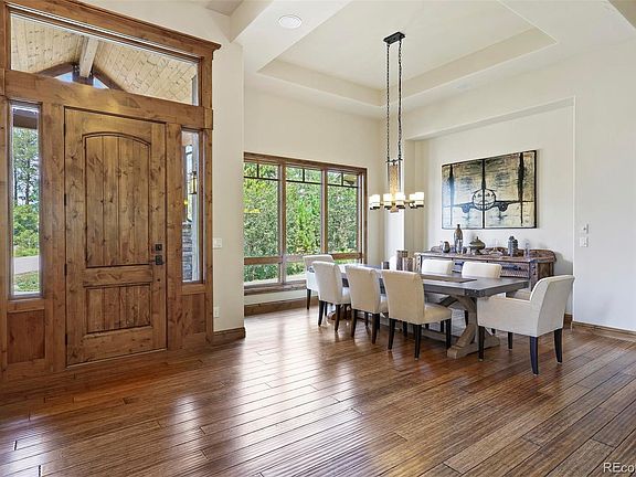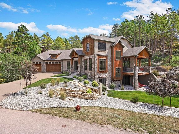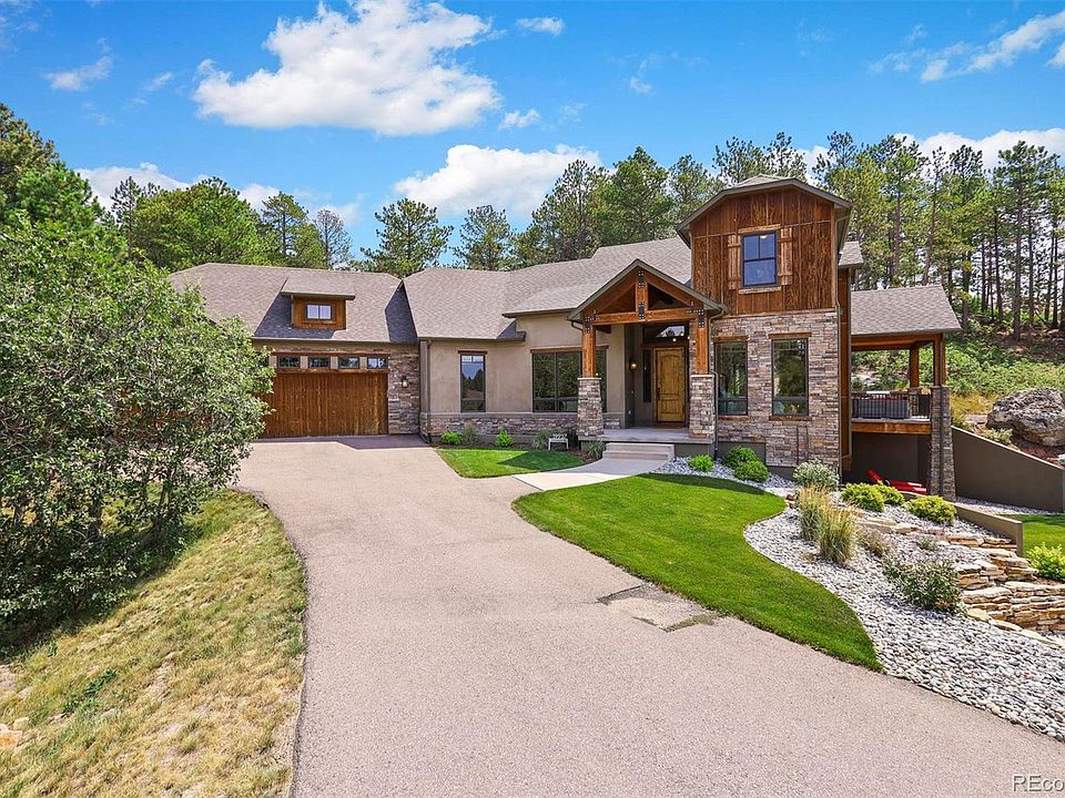 Welcome home to Chisholm Trail! This mountain-contemporary ranch home features all the bells and whistles you expect in a custom home. Set on more than ½-ACRE WOODED lot, this home will not disappoint. The gourmet eat-in kitchen includes an island Viking 6-burner cook top, stainless steel dishwasher, double wall ovens, microwave, refrigerator, and two sinks. The large family room with hand-placed natural stone fireplace/hearth/mantel opens up to a COVERED DECK facing west that features STUNNING VIEWS OF PIKES PEAK. The backyard patio includes a full OUTDOOR KITCHEN with gas grill, refrigerator and sink plus a built-in fire pit. The main floor master bedroom includes a cozy fireplace and en-suite bath with a large zero-entry shower, double sinks and a California Closets closet system. The SECOND main floor bedroom is super easy for guests as is the second main-floor full bath. Take a quick flight up the stairs to a private THIRD view-filled bedroom or study (it's the only thing on that floor!) The very large laundry and mud room features built-in storage and leads out to the 6-CAR GARAGE! Plenty of room for cars and toys! The basement features a SECOND MASTER bedroom, plus an additional en-suite bed/bath. You will find a full EXERCISE ROOM with mat flooring. Also featured is a game room, a wonderful BAR featuring wood-top seating, refrigerator, wine cooler and dishwasher and full WINE ROOM with custom racks. The rec room features another hand-placed natural stone fireplace and walks out into a wonderful patio with more views of Pikes Peak!
