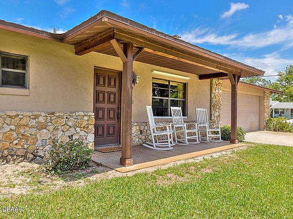 Beautiful, impeccably maintained home with NO HOA and a 22' x 18' DETACHED garage/workshop/boat/RV Storage. This conveniently located home is on a large corner lot giving you plenty of room to enjoy the beautiful yard. From the covered, tiled front porch you will enter the living room with stunning wood flooring and a wood burning fireplace. The Kitchen has been updated with Oak Cabinets, Stainless Steel Appliances and recessed can lighting. The Dining Nook is perfectly located next to the Kitchen and open to the living room. The wood flooring continues in the hallway and extends in to the Master Bedroom and guest Bedroom. The Master Bedroom has a walk in closet and an attached Bathroom with walk in Shower and Granite counter on Vanity. More..... Guest Bathroom has a granite counter top, Shower/Tub combo with newer shower doors and newer toilet. There is a Huge glass enclosed Florida Room (included in Living Square Footage) with a separate mini split Air Conditioner for maximum comfort. The home also has storm shutters, a security system, vertical blinds on most windows, A/C replaced in 2021 and water heater replaced within the last 3 years. All of this and located just minutes from shopping, banks, restaurants, hospital and a short drive to the "Worlds Most Famous Beach."