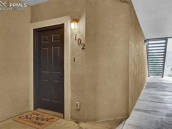 Lovely first level Condo in the beautiful Saddleback Ridge Community nestled amongst some of the most scenic areas of Colorado Springs. Entryway with coat closet, opens to a separate Dining area, a large Kitchen with a Counter bar, and a spacious Living Room with a gas log Fireplace and walk-out to a covered Patio perfect for morning coffee or grilling. The Primary Bedroom has a coved ceiling, walk-in closet, and adjoining Full Bath. Tucked behind the Living Room you’ll find a good-sized Secondary Bedroom, another Full Bathroom, and Laundry Closet. As an additional bonus, this property includes an oversized one car Garage, with storage shelves. If you love low maintenance living this is an ideal set-up. You’ll have plenty of time to explore Ute Valley Park, Pinon Valley Park, and Garden of the Gods!