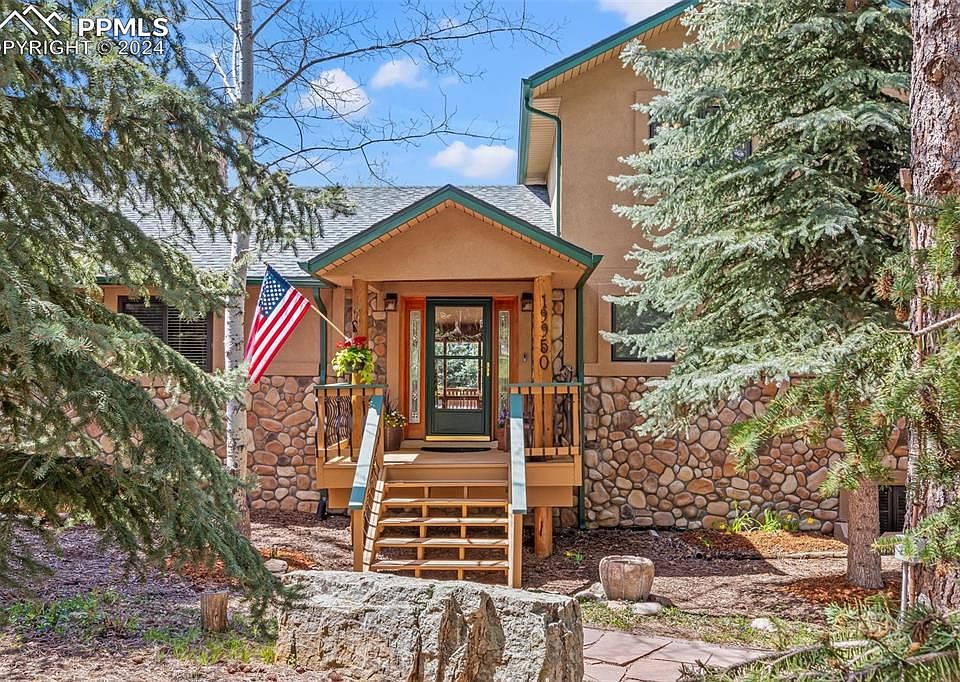 Perched along a Monument hillside, this contemporary mountain retreat seamlessly blends with its natural surroundings while offering spectacular views of Elephant Rock and other peaks. Set on a sprawling 2.5-acre lot, this gem provides ample space for family fun, work from home, relaxation & entertaining. With almost 5,000 sqft., the six bedrooms & five bathrooms, fit a variety of wants & needs. The walk-out basement is another bonus! The exterior of the home features a combination of traditional mountain home features, stone-like accents, and expansive windows that showcase the breathtaking vistas beyond. Guests are immediately greeted w/ the warmth & character of the interior. A striking fireplace & vaulted ceiling serves as the focal point of the living room that opens onto an elevated deck w/ plenty of living area & southern exposure. The open-concept living areas seamlessly integrate the kitchen, dining, and living spaces, creating an inviting environment for gatherings. The gourmet kitchen is a chef's dream, equipped with high-end appliances, custom cabinetry, spacious island w/seating walk-in pantry & 3-antique doors that convey. Main level laundry is highly desired. The primary bedroom suite is a private oasis, featuring a bathroom w/ soaking tub, dual vanities, walk-in shower & linen closet. Immediate access to the sunroom/exercise room & jacuzzi completes this serene retreat for R&R. Add’l bedrooms & bathrooms accommodate guests w/comfort & privacy. Multiple decks & patios on all levels provide ample space for outdoor living & dining. You won’t easily forget the sunken firepit and horseshoes. The 3-car garage is a dream! Top of the line generator, main electric panel, dual water heaters/furnaces keep this home humming. With its stunning architecture & landscape, flexible floorplan &unparalleled views, this contemporary mountain home offers the ultimate retreat for those seeking tranquility in a breathtaking natural setting.