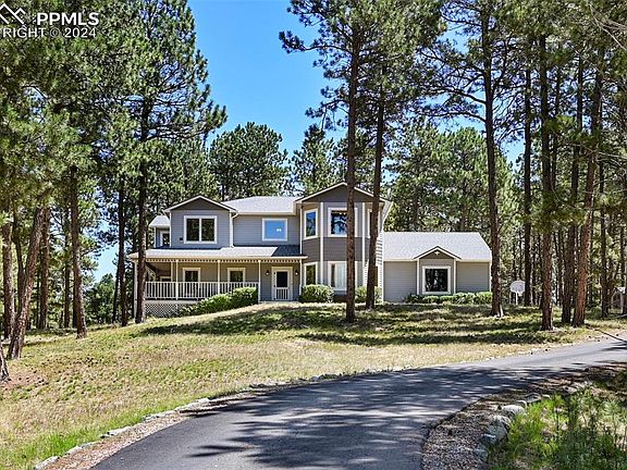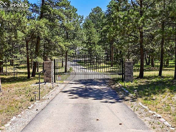 Stunning custom built home on over 5 acres of wooded paradise! Enter into the open foyer with beautiful hardwood flooring and tons of natural light! The main level features an open floor plan with 2 spacious living areas and a convenient home office with double french doors. The kitchen opens to the dining room and onto the family room with wood burning fireplace and walk outs to 2 large decks, perfect for entertaining. The upper level hosts the master suite with private spa like bath. 3 additional bedrooms with shared full bath complete the upper area. The lower level has a huge family room with walk out to the cozy patio. Also located on the lower level you will find another bedroom, full bath, and an expansive storage room. Private, gated lot features room to let your creativeness go wild! Acres of land for horses, goats, pets, or whatever you desire! Newer class 4 roof and furnace. Situated in the woods but easy access to I25 and all the amenities!