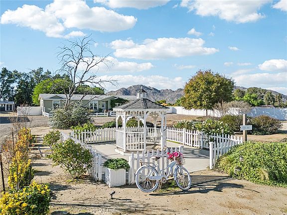 Welcome to 19957 Hansen Ave, a beautifully upgraded 1,814 sqft, 3-bedroom, 2-bath home set on a flat, fully usable one-acre lot in Nuevo. This unique property is fully enclosed with vinyl fencing and includes an impressive 40’ x 30’ metal shop/garage perfect for storage, projects, or hobbies. Behind the home sits an incredible full Western town complete with four custom buildings and a party deck. The saloon is equipped with air conditioning, while the blacksmith shop offers 60-amp power for welding. Additional conveniences include a dedicated RV hookup with 60-amp service and water, as well as an expansive assortment of plants and trees throughout the property, all maintained by irrigation timers. Step through the front door and you’re welcomed by a modern country ambiance highlighted by distressed wood laminate flooring, tall baseboards, vaulted ceilings, large windows, and tasteful lighting. The great room is truly the heart of the home, with the stunning kitchen at its center. Shaker style white cabinets, quartz countertops and backsplash, a farmhouse sink, hideaway trash can, stainless steel appliances, and a large island with bar seating create a perfect blend of style and functionality. The kitchen opens seamlessly to the dining area and family room, where a custom built-in entertainment center showcases a large flat screen TV, sound bar, and 3D fireplace, making the space ideal for relaxation and entertaining. The spacious primary suite features vaulted ceilings and an en-suite bathroom with dual sink quartz vanities, a large soaking tub, and a separate shower. Two additional bedrooms offer generous space, and the home includes a dedicated laundry room for added convenience. Outside, a concrete pad accommodates the 15-foot above-ground pool, complete with an upgraded pump and filter, providing a refreshing retreat during warm summer months. This one-of-a-kind property blends modern comfort with rustic charm and offers endless possibilities.