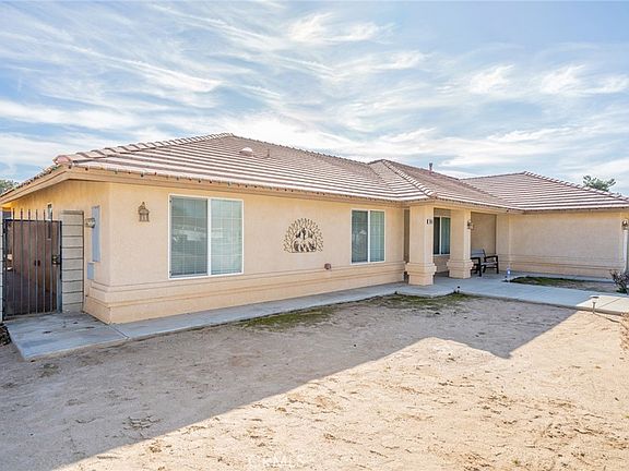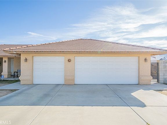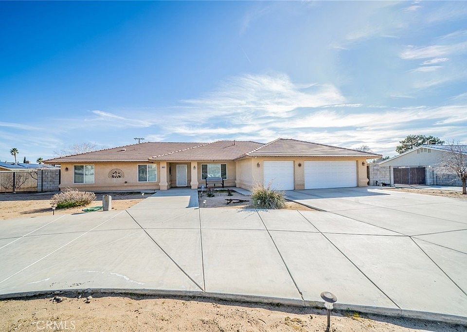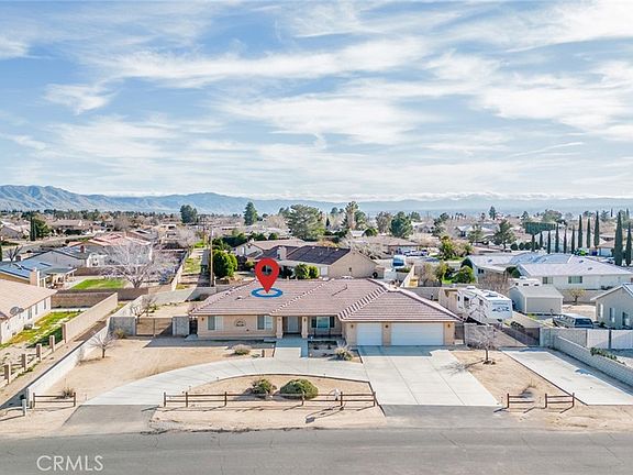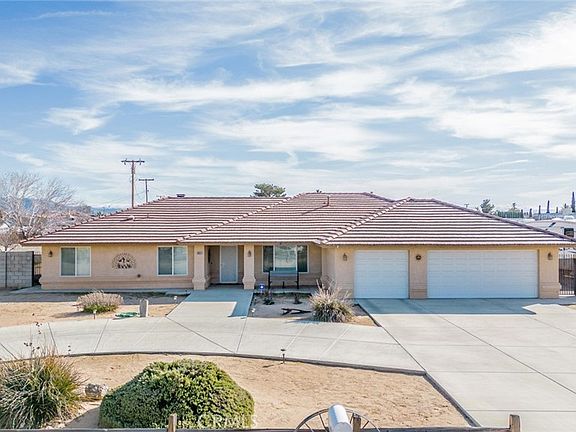 Come and see this incredibly beautiful Apple Valley home sitting on just over half an acre with so many amazing views and features! This custom-built 2,442 sqft three-bedroom, three-bath has everything you would want in a high desert home!! The coveted circular driveway at the entrance of the property and the driveway in front of the 800 sqft three-car garage are all concreted; as well as the RV parking pad on one side of the home (with electrical hookups) for easy pull-in and gated storage. The overhang around the house is 30" wide for extra coverage. Wait til' you see inside!! This beauty has arched walkways throughout the home and newer wood-look flooring throughout. Upon entering there's an office or sitting room (whichever is your preference) to the left. And a separate dining room to the right. The kitchen has a stone-tile countertop that can also be used as a breakfast bar with barstools plus a breakfast nook area with bay windows. There's a super-sized pantry too! The spacious living room has a floor-to-ceiling brick fireplace that is perfect for enjoying cozy winter nights with family and friends. There are two spacious master bedroom suites to choose from. One is 18x16 with walk-in closets and a master bath that has a garden tub and an easy walk-in glass-enclosed tile shower. The second master suite is 14x15 with a private bathroom. Newer HVAC system. Tile roof. A second RV parking gate is on the other side of the property for more desert toys and parking possibilities!!! Three sheds are also included. Wired in-home alarm system. And SO MUCH MORE!!! This property is a must-see!!! Call now for an appointment!!