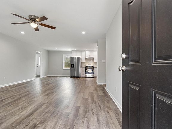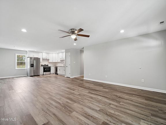 This beautifully built home features stainless steel appliances, including a refrigerator, and elegant LVP flooring in the living areas with plush carpet in the bedrooms. Enjoy the convenience of wood shelving in closets, recessed lighting throughout, and a single-car garage. The spacious .52-acre lot includes a charming covered front porch and a cozy raised concrete patio in the back. The master bathroom boasts a walk-in shower and double vanity. Additional features include black gutters and a well-crafted design. Call for more details!