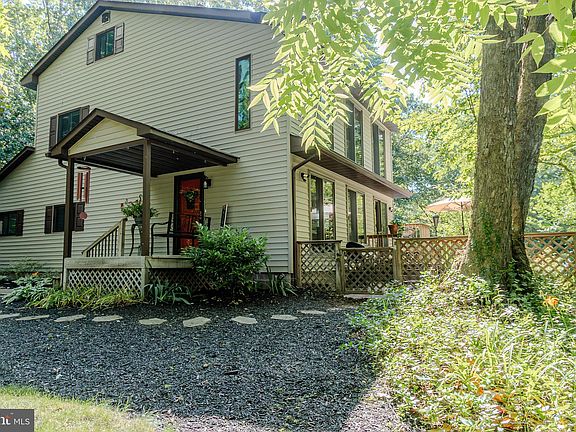This distinctive contemporary home offers a rare departure from the ordinary. Nicely renovated between 2018 and 2023, nestled on a lush landscaped 1-acre lot, the home blends modern updates with a peaceful retreat type setting. With over 2,500 square feet, this 2-story home includes a full-size bonus attic (third floor), providing flexibility of a 5th bedroom. Two fully updated bathrooms complement the functional floor plan. The updated kitchen consists of granite counters, farmhouse sink, stainless steel appliance and updated lighting. The charming brick floors add warmth and texture to the space. Six full-sized sliding glass doors on the south side—three on each level—enhance the home's passive solar design, maximizing natural light and energy efficiency. This main level also includes 2 bedrooms and a bathroom that showcases modern finishes while preserving the home's unique character. Hardwood floors extend throughout the upper level, where two additional bedrooms and another custom full bathroom. Access to a finished attic space—an adaptable, unique area—that connects to an unfinished, floored section providing abundant storage. Step outside to enjoy the private, well-manicured grounds complete with a 24' round above-ground pool and a tranquil pond creating a perfect setting for relaxation. Additional features include a freshly repainted interior, interior workshop, paved driveway, detached shed, and a brand-new heat pump installed in 2024.