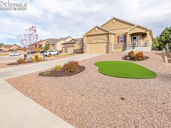 Nestled on a generous 1/3-acre lot and on top of a hill, this home offers the privacy you've been looking for in the wonderful Misty Acres neighborhood! South facing with prime views of Pikes Peak, no HOA and in the highly acclaimed D38 Lewis Palmer School District. Main level living, large primary suite and finished basement. Open concept living room with a gas fireplace, dining and kitchen with bright windows and vaulted ceilings, 3 bedrooms on the main level and two more very nicely sized bedrooms in the garden level basement with a full bathroom. Natural wood floors throughout with clean carpet in the bedrooms and in the basement. There is a custom gate at the top and bottom of the stairs. You'll find plenty of storage throughout and many deep walk-in closets with an extra shed in the backyard. The basement also has an unfinished room that could be an additional bedroom, used as storage, work space or even a home gym. The basement has been pre-plumbed for a wet bar. The exterior has a drip system throughout and artificial grass keeps the front and backyard looking great all year long! The backyard is fenced in and feels like a local park. 42 min commute to DTC and a short commute to downtown Colorado Springs. I25 is so close without lots of stops whether you're commuting up north or down south. Enjoy air conditioning, whole house humidifier, water softener, custom entryway, very well kept neighborhood without the cost of an HOA, hardwood flooring, 2021 trex decking and widened back patio with brand new landscaping in the front and back, gas appliances and a sink in the main level laundry room.