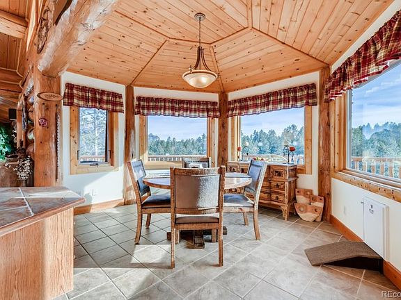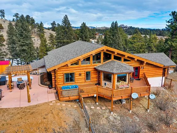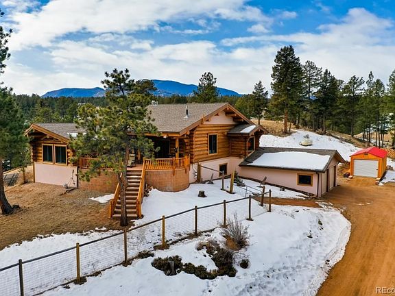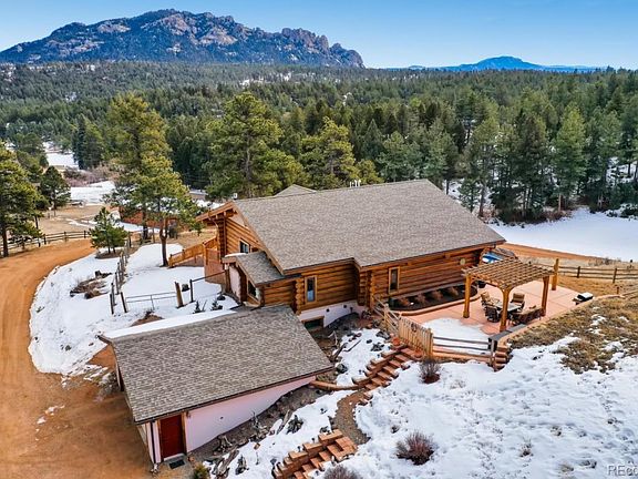 GORGEOUS hand-hewn LOG HOME (Englemann Spruce logs from Montana) with unique floor plan, is nestled on almost 11 ACRES of PRIVACY, with amazing mountain VIEWS & community pond! The property sits within an unique EQUESTRIAN community, that's surrounded by Pike National Forest. Enjoy world class riding, hiking, biking & fishing, practically in your backyard! The lot has been fire mitigated & the national forest immediately around the community has recently been mitigated. After enjoying extensive recreational opportunities, relax in your cool in the summer & warm in the winter true log home! The home features a gourmet kitchen with Schroll Hickory custom cabinetry & stainless steel appliances. The living room lends a cozy feeling with its cast iron wood burning stove. The large master bedroom features a cast iron gas stove & is adjoined by an amazing 5 piece master bath, with spa like atmosphere! Three outdoor areas, one stamped concrete patio, another with a pergola, & a new large composite deck afford space for entertaining or relaxing! ADDITIONAL FEATURES this home offers: Seller OWNED, NET POSITIVE, ground mount 10KW SOLAR panel system; whole house humidifier; hot tub; no carpet (except on stairs to basement); radiant in floor heat on main floor, baseboard heat in basement & garage provided by high efficiency boiler; dumbwaiter to transport groceries to the main level; tongue & groove vaulted wood ceilings; two fenced in areas for your pets; huge storage area, workshop/mudroom in basement. MAJOR UPGRADES by seller: 2018: NEW Anderson windows & Pella exterior doors & slider (except garage), NEW Cumberland garage 12'x30', NEW COMPOSITE deck and joists, NEW CORK flooring in finished basement area, NEW stamped concrete patio. stairs, & log railing. 2017: NEW radon system, NEW CEDAR fence & gates on west patio, exterior south facing logs completely refinished-others washed & clear coated. Seller will provide a HOME WARRANTY. Seller is a licensed realtor in Colorado.