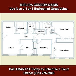 Miriada Luxury Condos, 3 Bedrooms, 2 Baths + Den w/Closet. Hardwood Flooring, Granite Counter Tops, 2nd Floor Opportunity. The community offers 24 hour access control, tennis courts, dog park, fitness center, playgrounds and lots more. Call today to schedule a tour at Miriada.