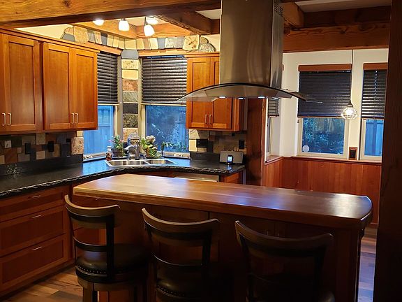 Truly stunning! This 4 bed 2 bath is full of character and style with beamed ceilings, raw edge granite counter tops and beautiful cherry wood carried throughout. This home sits at the end of the cul-de-sac, close to a pasture and pathways. There are neighbors on only one side. You can garden on the south side with existing garden beds and there is room to add more. This home is designed for sustainability with passive solar energy, Heat recovery ventilators and a on demand water heater. The exterior has also recently been painted, new exterior lights have been installed and newer flooring throughout.