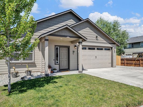 This beautifully designed, single-level home offers a spacious yard and an unbeatable central location. Inside, you'll discover three generously sized bedrooms, including a luxurious primary suite with a dual vanity and walk-in closet. The open-concept layout is both airy and inviting, featuring a cozy gas fireplace and a convenient laundry room. The modern kitchen is equipped with stainless steel appliances, a gas range, and a breakfast bar. Step outside to a covered patio and a lush backyard, perfect for unwinding after a busy day. Situated with easy access to shopping, dining, downtown Redmond, and a neighborhood park and playground, this home is ideal for first-time buyers and presents an excellent turnkey rental opportunity for investors.