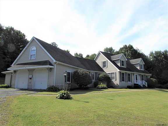 Peaceful, country setting...easy commute to Regeneron, Troy, Albany. Set on two acres with a sweeping front lawn, private back yard that extends into the wooded area. First floor master bedroom with door to back deck. Master bath updated 2017. Open concept kitchen. Adjoining family room has pellet stove. Second floor has two spacious bedrooms, loft area with window seat that is also a cedar chest, library area, skylights and walk in attic storage. Basement has finished area, plenty of storage and secondary egress via garage. Large two-car garage has 11' ceiling, pull down stairs to attic. Your backyard getaway features: 16 x 32 in-ground pool, pool house with bathroom, huge deck, fire pit, fenced dog run. Breezeway with bonus storage space. USDA Eligible!