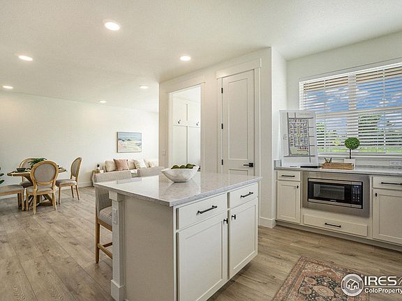The Acadia plan features a main floor primary suite with 2 bedrooms and a spacious loft upstairs. This end-unit features an open floor plan with tons of natural light, standard finish package including quartz countertops, tile showers, painted cabinets with 42" uppers and crown molding, stainless appliances and window blinds included. Finished Basement. Each home has a fenced front yard and there is a community dog park, play structure, and greenbelts throughout the development. The oversized 2 car garage provides ample parking and there is room to grow in the unfinished basement with 9'ft foundation walls (option to finish).This incredible community is conveniently located in Northwest Loveland, close to regional trails, open space, shopping, easy access to Fort Collins, Loveland and breathtaking mountain views.