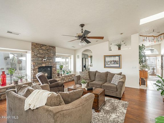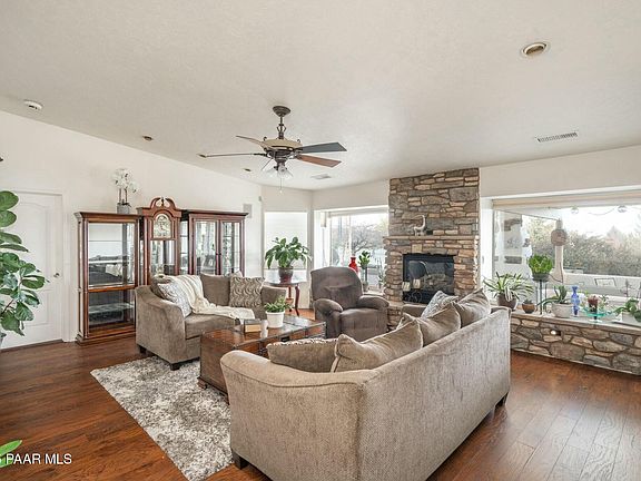 Wonderful pride of ownership in this property! Beautiful 3 bedroom, 2 bath home with custom kitchen. The kitchen features lots of counter space & eat-in area. There is a large great room with a stone fireplace. The home features wood flooring along with tile & carpet & 3 fireplaces. The master suite is exponentially large & features a gas fireplace. There is a lot of storage in the home & the lighting is inviting throughout. The 2 car garage houses the HVAC unit with permanent filter & humidifier system on it. The outdoor living space is exceptionally large featuring 3 separate seating areas & & yet another fireplace. This corner lot location has been beautifully cared for & it's definitely one you'll want on your list. The home is approx. 2175 & was built in 1998.