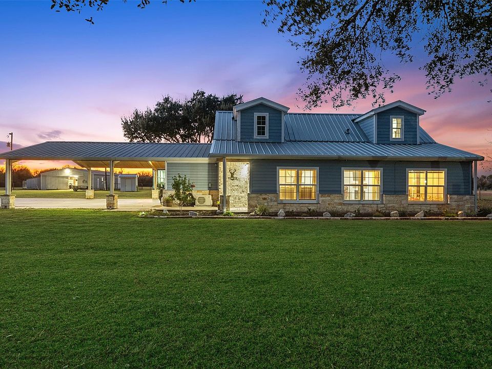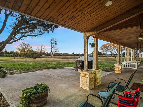 Set behind a gated entry on approximately +/- 5 acres, this well-maintained country property offers space, privacy, and versatile improvements. The main home features an open living and dining area with durable flooring, updated lighting, and a potbelly gas stove adding warmth and character. The kitchen is designed for everyday function with stainless steel appliances, ample cabinetry, tile backsplash, farmhouse sink, and a center island for prep and gathering. The layout includes two bedrooms downstairs and a private primary suite upstairs. Bathrooms feature updated finishes, and replaced windows provide natural light throughout. Outdoor features include a metal roof, covered front and rear porches, long concrete drive, fenced pasture, and multiple barns and outbuildings. Mature trees and open pasture complete this inviting rural setting.