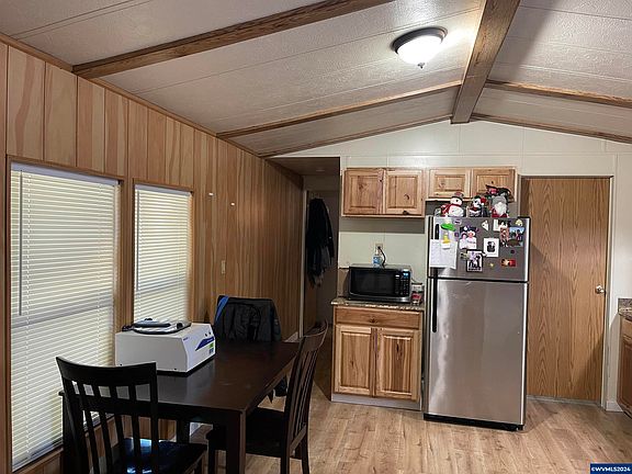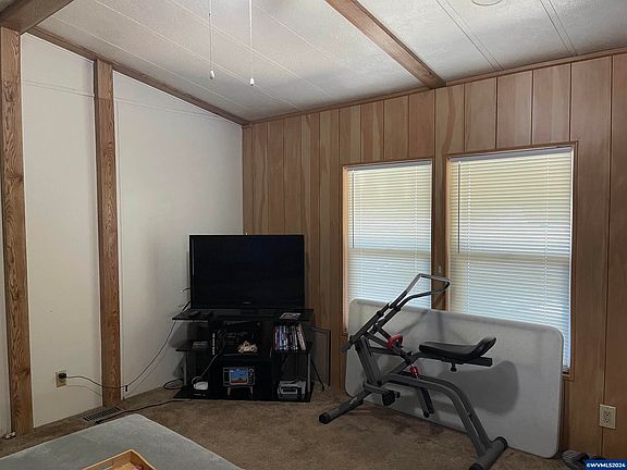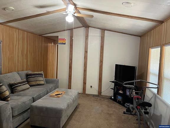 Woodburn Sr Estates! 1984 Redman single wide with recent updates including new windows, heat pump, kitchen cabinets, counter tops and flooring, and metal roof.Vaulted open floor plan with two primary suites - one at each end. Convenient kitchen includes all appliances; breakfast bar. Low maintenance grounds. Garden Shed. Attached carport.