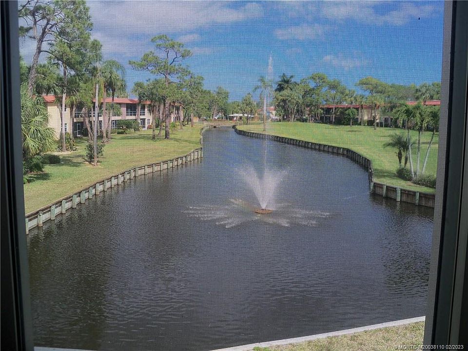 What a view of the lake and golf course !! Relax and enjoy the view. Master bedroom with walk-in closet. Glass enclosed tiled balcony with storage closet. A/C replaced. Kitchen with white cabinets and corian countertop
