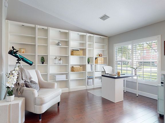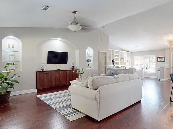 4 BR, 2 BA open floor plan home, located in the highly desired gated Lake Tuscany community. With a very large kitchen overlooking the huge family room, you can easily entertain family and friends and still be part of the conversation This home features stunning walnut hardwood floors throughout. The kitchen features high end wood cabinetry with soft close cabinets and pullouts, granite counters, marble backsplash, and stainless-steel appliances with a wall oven and cooktop stove. Architectural features include niches and custom built-in bookcases with lighting. This home has a split bedroom plan with 3 Spacious guest bedrooms and a large cabana bath on one side of the house and a large master suite on the other side. Light and bright master bedroom has extensive woodwork and crown molding.The master bath features a walk-in shower, large garden tub, plantation shutters, and double sink vanity. There is plenty of room to add a pool to this large fenced yard with extended patio. Lush tropical landscaping gives this home plenty of privacy. MOVE IN READY!