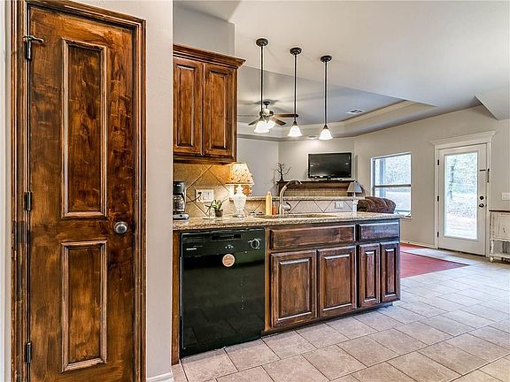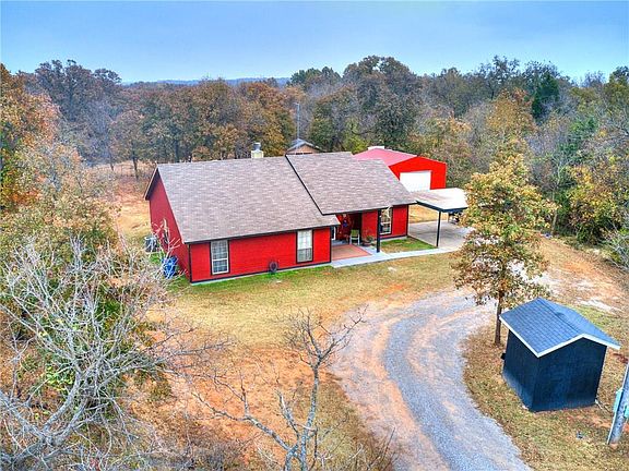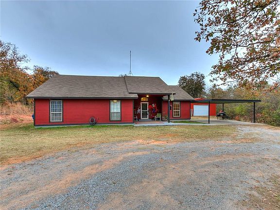 The American Dream! Perfect location! Only 20 minutes to Tinker AFB, 10 minutes to Kilpatrick Turnpike, 25 minutes to brick-town, 10 minutes to Lake Arcadia/Pops and UNDER and hour to Tulsa! Peace and tranquility will be your norm! Livestock is allowed on this 2.5 acre private lot. Trees and hills galore--in addition to the shop, barn, and livestock opportunities, you will appreciate jumping on your 4-wheeler/ATV and riding down the creek and over the hills of your personal land! The home has 4 bedrooms, 2 bathrooms, a 2-car carport, a 2-car detached garage (a 24x24 shop), a 20x20 pole barn, a 40x70 fenced in area for pets, and this just breaks the ice! Your unique property boasts fresh paint in the living/kitchen/and halls, granite, crown molding, breathtaking views and more. Your outside living area is paradise. Take the virtual tour to to see the beautiful trees, the creek, and view--1/2 the creek is owned by YOU! Look at this price!