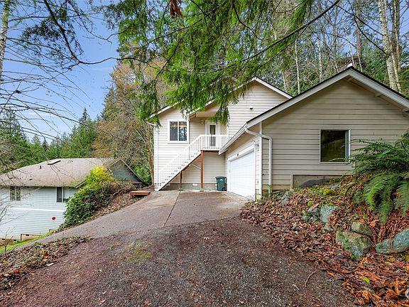 Nestled atop a hill and surrounded by forested beauty, this charming 3-bedroom, 1.75-bath home in Sudden Valley offers a peaceful retreat. The living room features a cozy gas fireplace and sliding glass door access to the deck, perfect for enjoying the peaceful setting. The kitchen is brightened by a skylight and offers Corian countertops and ample cabinet space. The spacious primary suite has forest views and includes a walk-in closet and en suite bath. The large roughed-in daylight basement provides versatile space, ideal for a workshop or additional storage. Huge two car garage, too. Located near parks, trails, and amenities, including golf, marina, and beaches. This home combines comfort, functionality, and natural surroundings!