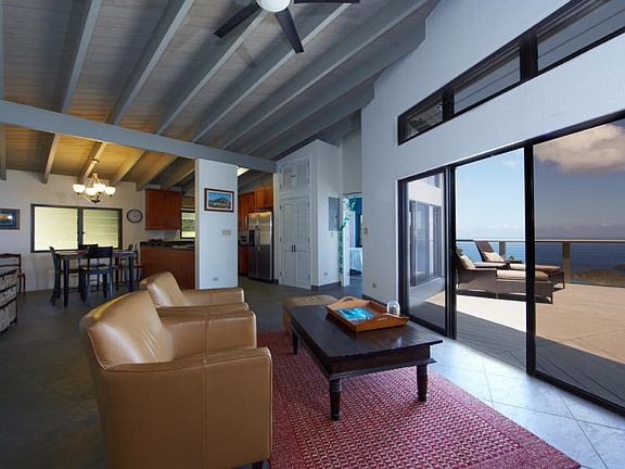 Walk in the front door and feel like you’re on top of the world. Spectacular panoramic views of Neltjeberg Bay, Hull Bay and down island. 2 Br 2 Bath main house with attached covered carport (breezeway), laundry room and a separate air conditioned structure currently being used as an office. Large deck for entertaining. Roll down and accordion hurricane shutters and 13kw automatic generator. One BR apartment for guests or rental. Well maintained and constructed concrete home. Gated entry with ample parking and walk in entry to the main house. Includes .76 acres of tropical paradise. No hurricane damage. $645,000. Realtors welcome !