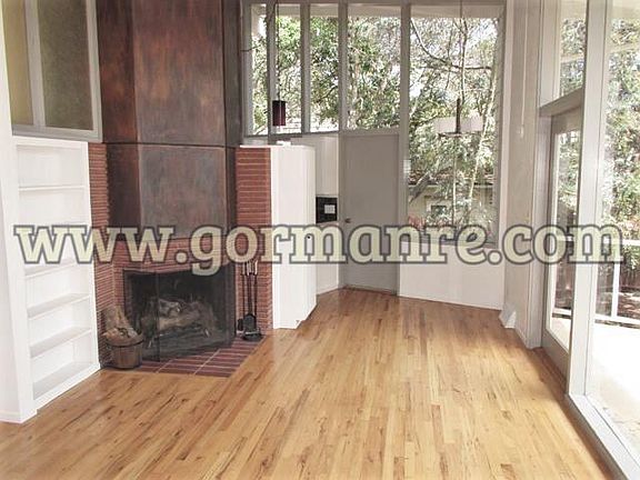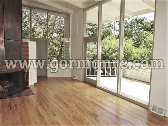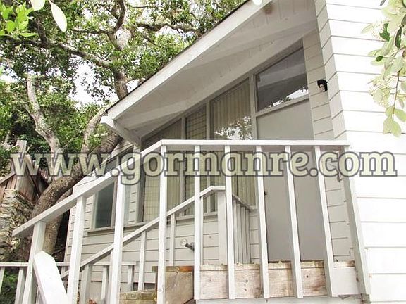 Carmel-By-The-Sea clean 2 bedroom 2 bathroom home designed by Henry Hill with lots of light, nestled among the oaks near the Forest Theater. It features a modern style that uses angles in every room. It has approximately 870 square feet of living area on two levels once you enter the home. The living room is open, light, and spacious and features soaring open beam ceilings and a brick wood-burning fireplace. It has access to a large deck that has views of the trees that surround the home. Except for the kitchen and bathrooms, which have tile flooring, all of the flooring is beautifully refinished oak hardwood floors. The kitchen is small, but efficient, and features tile counters, a 20" refrigerator, a 20" electric range/oven, and a disposal. Both bedrooms are up a small flight of stairs and feature open beam ceilings and each has their own bathroom. One bedroom has a door with direct access to the exterior. One bathroom has a tiled shower stall and one has a tiled shower-over-tub. The home has central heating. There is a one-car carport and an extra parking space in the driveway. Off the carport, there is a storage room that has a laundry area with a washer and gas dryer (left by a prior occupant -- no warranty). Rent includes basic gardening and sewer. No smoke/pets. Available immediately.