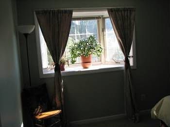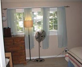 A fire place and French doors on each side of living room. Bay windows in dining room and both bedrooms.