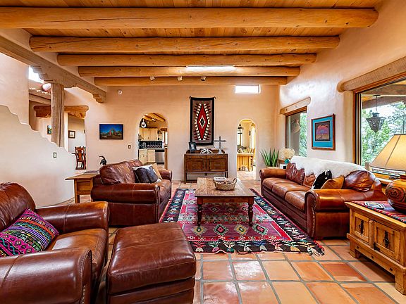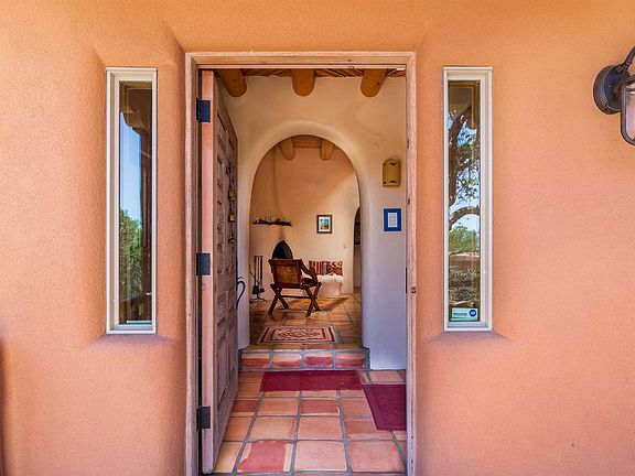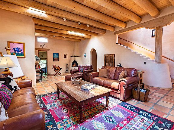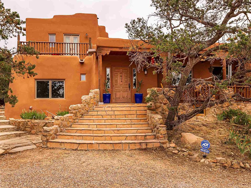 Come home to this classic adobe with incredible character and authentic old west pueblo vibe. This home on 9.4 acres includes a main house on one lot and an adorable 2BR casita with separate private drive and entrance on the other. Explore your pinon and juniper-studded acreage with views of three mountain ranges, enjoy spectacular sunsets from your west facing upper balcony and sip coffee from your front porch with the sound of the wind in the trees. The craftsmanship of this home is truly stunning with ceilings that average 12-18 ft and include vigas and a variety of latilla finishes, three kiva fireplaces, diamond plaster walls, saltillo tile and knotty pine floors, Mexican talavera tile in baths, hand-scraped pine stairs, two master suites- one up and one down- a cozy sunken den, a large third bedroom with sitting area, kitchenette & separate entrance, formal dining room, eat in breakfast area, new double convection oven, spacious laundry room with utility sink, office or nursery next to upper suite and a beautiful sauna. Recent updates include a new roof, new windows and new stucco. There are four wonderful outdoor seating areas for entertaining and grilling and a 2-car carport. Such a peaceful, private country property with its own well. The property feels secluded and private, yet is close enough to downtown to easily enjoy all its charms. Shown by appointment.