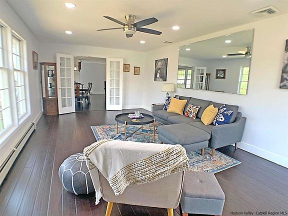 Ranch living at it's best -- step-in, move-in, live! This house has space to spread out ("think big") with an elegant modern style, large windows and light galore. The open floor plan features a gourmet kitchen with stainless steel appliances, elegant white quartz countertops, and an expansive island that creates room for baking, and lends itself to entertaining, as a place to have a glass of wine while you chat with the chef. There's a large pantry off the kitchen that is currently being used as a first-floor laundry area. Kitchen is appointed with clean, crisp, stainless appliances; including an under-counter wine cooler. The garage steps right up to the kitchen so unloading groceries is a snap. Additionally, the large sliding glass doors to the back yard feature a back deck BBQ and is only 5 steps from everything you need. Beautiful hardwood floors run throughout the house marrying the front entry way to an open dining area/living room and down a long hall to 4 bedrooms or 3 w/ an office (town of Ulster considers this 3 BRs). Bright modern fixtures bathe the bathrooms in light. The house, perched above the road, feels like an oasis. The main, oversized bedroom includes a walk-in closet and large main, modern bathroom w/glass enclosed shower. The office space across the hall has a pocket door and there is a large bath off the hall family and friends. And that's not all! Really? There is a massive finished basement (1,700 sq. ft.!). The basement's high ceilings and superlative lighting give this space unlimited possibilities. A place to rest, a play space, media room, yoga or workout room, or a place to craft a quilt or create your next masterpiece. There is so much space downstairs that you could do ALL those things. The lower level has a 1/2 bath, additional storage, a second laundry room, and a mechanical room. There's a whole-house back-up generator. This home is perfectly located only minutes from the Kingston Waterfront, Uptown Kingston, the Rhinebeck bridge, Bard College, Saugerties, boating, shopping, and great restaurants. Live all on one floor or spread out... A pleasure to show and see. All you have to do is move in.