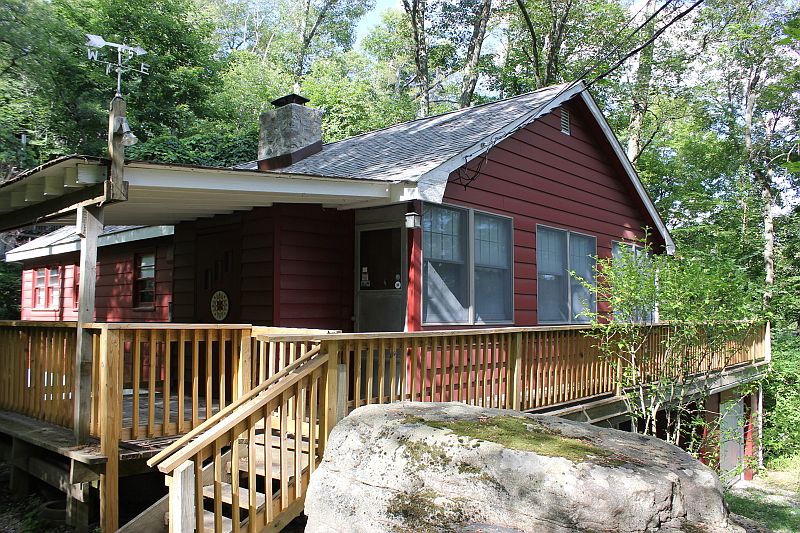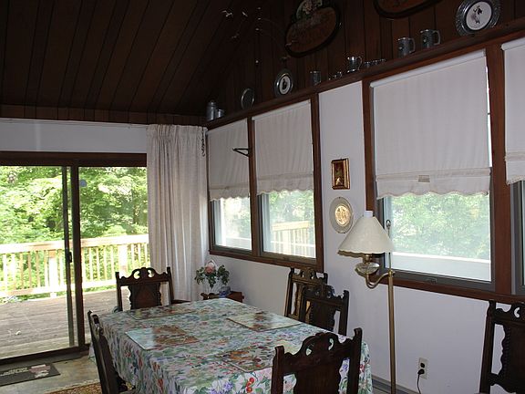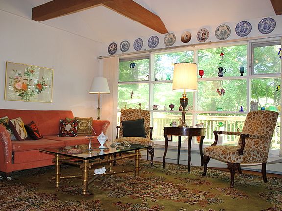 Charming, Private AND close to beaches!! 2 bed.2 bath ranch on large (over half-acre) wooded lot in a great location! Just across from Highland Lakes main lake, beach, clubhouse and boat docks!Covered front porch and wrap around deck-what privacy! Living room with beam décor & vaulted ceilings, floor to ceiling fireplace with wood stove insert & heatolater, full wall of windows, dining room with sliders and room for a breakfast table in the kitchen! Two bedrooms and full bath on main floor. Lots of space in the above-ground, fully finished lower level with laundry room, storage space, room for a family room, full bath and guest suite potential! Seasonal lake views, but plenty of privacy, too AND there's room for extra parking!