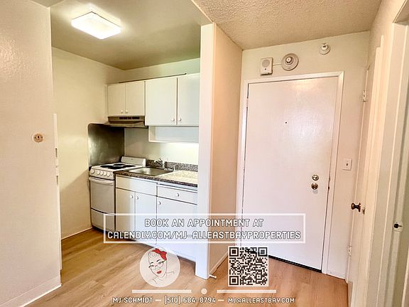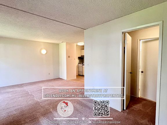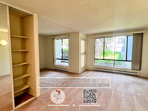 The unit features a functional layout with a living room, one bathroom, and a walk-in closet. The main living area is carpeted, providing a cozy atmosphere, and is illuminated by large windows that allow ample natural light and offer views of the surroundings. The kitchen, visible from the living area, features white cabinetry and essential appliances, creating an open feel to the space. and the presence of built-in shelving in some areas adds practical storage solutions. Watergate complex has an array of amenities: 4 swimming pools, spa, gym, laundry, tennis court. Close to everything you might need - public transportation, shopping, dining and access to the Bay Bridge. Maryanne "MJ" Schmidt DRE 02125244 *We are an Equal Opportunity Housing Provider and follow all fair housing laws. All East Bay Properties CalDRE: 01516255