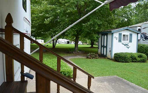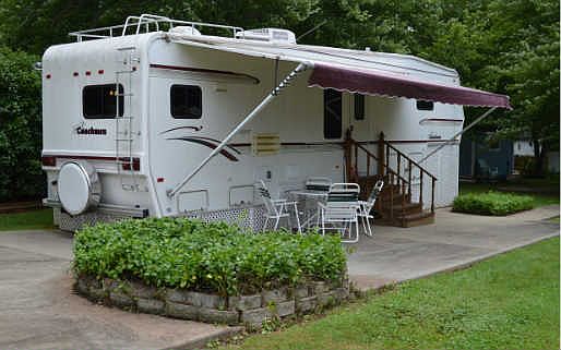 1997 Coachman w/2 slide-outs in well established RV community. Large oncrete drive can accommodate 4 vehicles. Open layout. Great Kitchen w/dbl sink + side by side ref/freezer. Full sized shower, extra cabinets, central air, surround system. Wind-up TV antenna in BR area, TV and VCR, Combo-Matic W/D unit. New 24' awning, Concrete slab for additional shed. Annual fee includes common area mowing, use of pool and club-house, sewer, laundromat, garbage pickup.New shingles on the shed. New Rubber Roofing installed 2014!