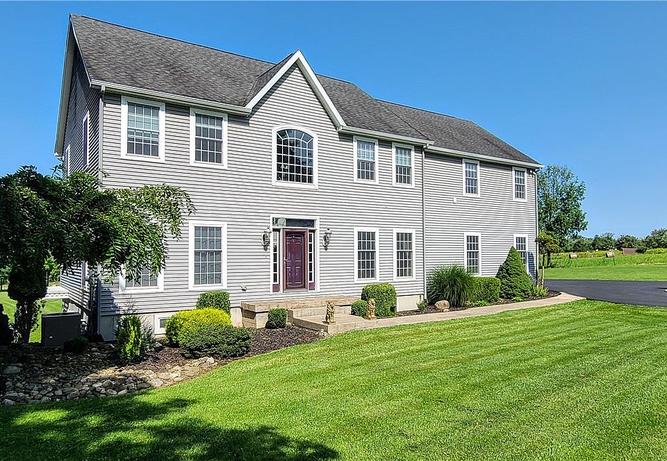 This expansive two-story home offers an abundance of natural light from sunrise to sunset and a spectacular outdoor living space that creates a vacation-like atmosphere. The main floor features a grand two-story entry, high ceilings, hardwood floors, and a spacious family room with a beautiful marble-tiled gas fireplace. The large maple kitchen is equipped with a center island and a breakfast room overlooking the views. Walkout lower level is primed for expansion, while the upper floor includes a primary ensuite, featuring a jetted tub and large walk-in closet, two additional bedrooms, laundry, and a sprawling 27x18 multi-purpose room. The property spans 2.32 acres of immaculately landscaped grounds, complete with a circular paved driveway, mature trees, sweeping lawn, natural stone features, and multiple patios. Outdoor amenities include a massive rear deck, a gazebo with a built-in BBQ, refrigerator, TV, and bar, as well as an inviting sitting area. For added relaxation, enjoy the outdoor fireplace or garden waterfall, making this space ideal for both entertaining and unwinding. Situated on the edge of Ithaca with convenient access to shopping, the lake, and Cornell University.