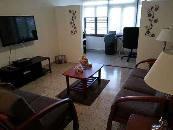 Condo/office, fully-furnished/fully-equipped, all utilities including DirecTV/Internet. 2 bedrooms, 1 bath condo (3 TVs; dining, living and bedroom furniture; kitchen appliances/kitchenware, bedroom set for each bedroom, full linen/towel sets). Office space with desk, computer, printer, phone, storage. A/C in living room and a/c wall units in each bedroom and ceiling fans throughout. 5 minutes from airport and 10 minutes to San Juan, not on the beach but close. Rental: $1500 a month plus $500 security deposit and a one-time $200 end-of-lease cleaning fee. No smoking, no pets. 3-month minimum lease. Showings from 10 am - 3 pm. All utilities included and a $200 non-refundable service charge (3-month minimum).