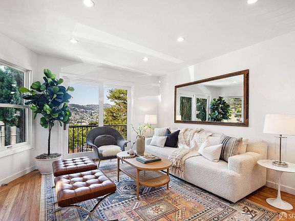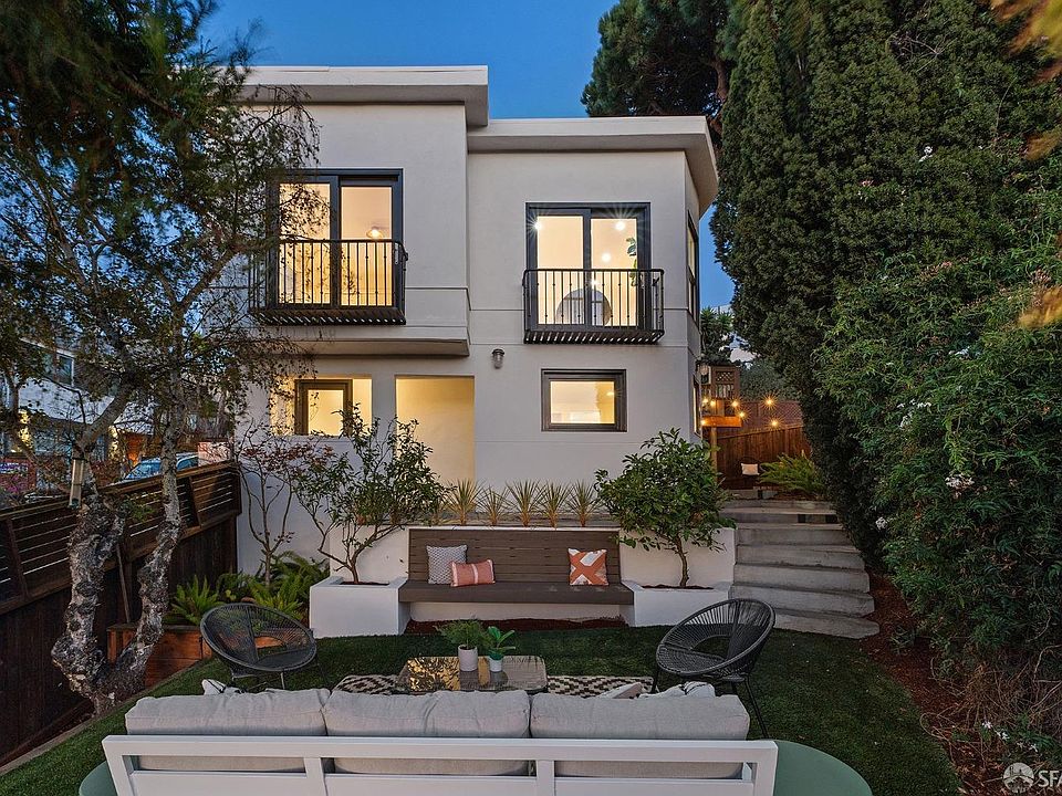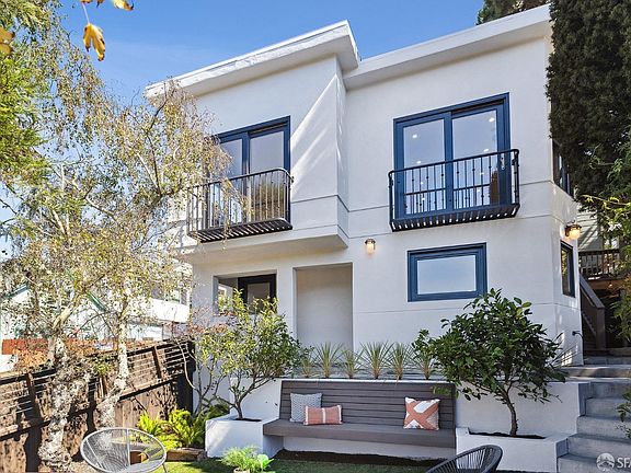 Perched on a corner lot in Bernal Heights, this distinctive semi-detached three bedroom two bathroom home offers a relaxed lifestyle with a private garden, deck, patio, one car garage, stylish finishes, and views. Lovely fenced garden surrounded by greenery & trees has tiered turf areas, planting beds & built-in bench w/ views to Twin Peaks. Upper level features refinished wood floors & open liv/din/kit w/ Juliet balcony & west-facing views. Remodeled kit w/ ssl appls, sleek cabinets, skylight, floating shelves, stone counters & island w/ bkfst bar plus access to spacious deck for al fresco dining. Sunlit front BD w/ west-facing views & closet w/ built-in storage. 2nd BD has lg closet w/ shelves & built-in storage unit framing window w/ peekaboo city views. Hall closet & handsome full remodeled BA w/ skylight & glass-walled shower. Lower level ensuite BD w/ views & window to garden, closet, built-in shelves & full BA w/ shower/tub. Hall closets & interior access to 1 car garage w/ freshly painted floor, stacked w/d, utility sink, storage & possible pad park. 96 walk score near shops, restaurants & transit in Bernal Heights, Noe Valley & Mission. A sophisticated, comfortable sanctuary, this lovely home is a unique and private retreat with a prime location for enjoying city life.