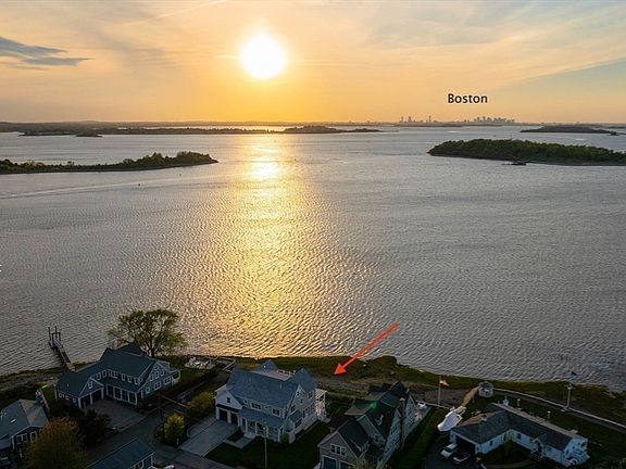 Stunning, WATERFRONT home on a 1/3 of an acre lot, 3+ years young, with over 5100 SF of living space and unobstructed VIEWS of Boston Skyline. This state of the art home features a chef's kitchen with beautiful custom cabinetry and high end appliances/amenities OPEN to a fabulous Family room with a 2 story wall of windows that floods the home with beautiful natural light and affords maximum views. The first floor also offers a cozy sunroom, beautiful dining room, a first floor guest bedroom that could also be a primary suite, and a gracious foyer that captivates you the moment you enter the house, because of the jaw dropping views. Upstairs there are 4 additional BR's and 3 full baths, including a LUXURIOUS primary suite w/ "to die for" closets and bath. The 3rd floor offers a game room with built in bar, large seating area, an office, half bath and LOTS of storage. Gorgeous deck with built in grill, hot tub and outdoor shower and rare level lawn space. The SUNSETS are mesmerizing!