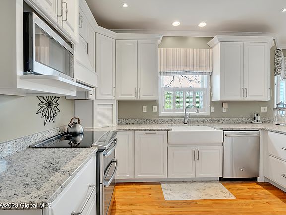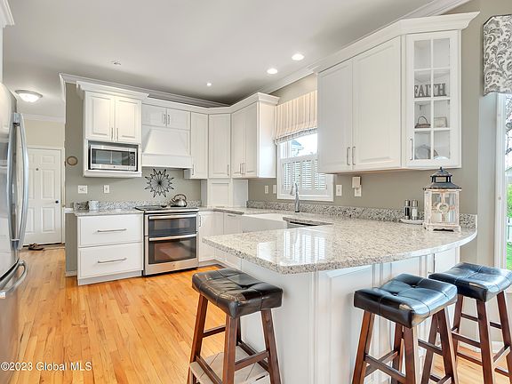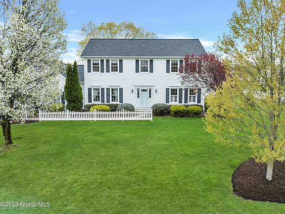 Absolutely stunning colonial on a picturesque lot within the North Colonie school district. This home features both a first floor suite as well as second floor primary suite, five bedrooms in all. The kitchen was beautifully redone in 2018 featuring high end cabinetry, farmhouse sink and granite countertops, including a breakfast bar. There are hardwood floors throughout much of the first floor, which includes both a living room and a vaulted family room, formal dining room, and study. The family room boasts a wall of built ins, gas fireplace, and entrance to the rear deck and patio. New roof, stone patio, and primary suite upgrades in 2021. Full basement with egress, Generac generator, large two car garage.
