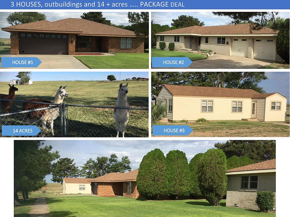 14.027 acres and 3 homes in Stinnett. The acreage and 3 homes will be sold together . You will love everything about this property . Stunning main home is 3 bdrm, 2 bath, two living areas. Cathedral ceilings featuring wood beams and wood burning fireplace flanked by beautiful built in bookcases.Spacious kitchen with double oven , Bosch dishwasher , tons of cabinets , kitchen nook large enough for nice size dining table located next to a gorgeous bay window. 2nd home in sale is also a 3 bdrm, 2 bath, 2 living areas. Awesome open kitchen with views into living, dining and sunroom. Bonus basement great for multiple uses. 3rd home in sale is a darling 2 bdrm, 1 bath home with an extra large oversized kitchen . You will love the mountain cabin feel of this home . Each home has new roof , private fenced back yard, private well, beautifully groomed acreage is all fenced as well . What are you waiting for