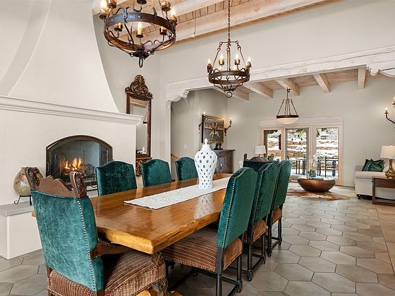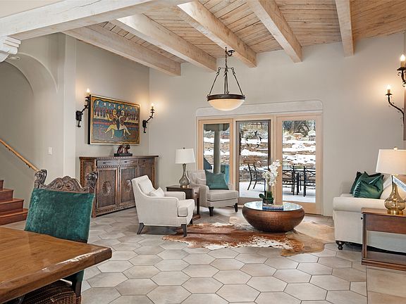 Embracing gem combining classic style with updated finishes, abundant natural light, smart floor plan, walled courtyard entrance with mature trees, koi pond, and a covered patio entrance. Nestled in a sea of green in gated Salva Tierra, only a 10 minute drive from town with privacy, security, and connection as needed. Relaxed elegance, warm and inviting, and ultimately livable. Remodeled by Frank Yardman, Interior Design by Jennifer Ashton. Chef’s kitchen featuring stainless steel Thermador appliances, custom cabinetry, large center island with quartz countertops, wine cooler, and a dining nook. The great room with high, whitewashed, beamed ceilings, custom chandeliers and lighting fixtures, and a majestic fireplace is open to a formal dining room and is perfect for entertaining. The owner’s suite has a private covered portal, kiva fireplace and spa-like bathroom. Luscious Spanish hickory flooring in the bedrooms. Radiant heating and radiant cooling. Central water filtration. Outside, a tiered and landscaped backyard with flagstone and brick patios all enclosed by a coyote fence. Great care and meticulous maintenance provide worry free ownership. Salva Tierra has Tennis and Pickleball courts and is revered by those who are religious about their daily walks! With Arroyo Vino Restaurant and the Club at Las Campanas nearby, access to the greatest of the great outdoors, this rare offering presents Santa Fe living at its finest! Homeowners rarely leave Salva Tierra, come see why!