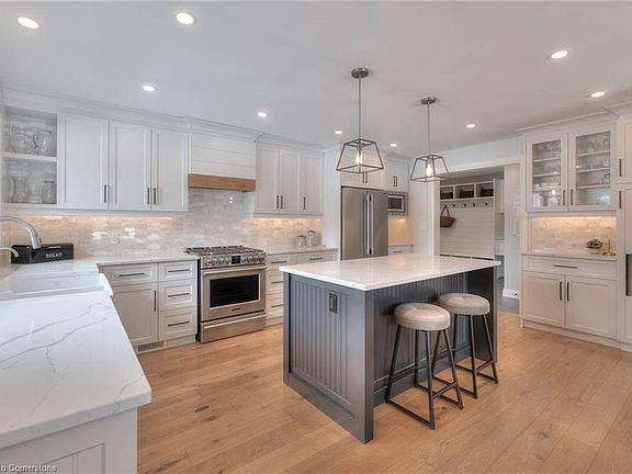 Nestled in the sought-after Birdland community, 2 Bluejay Rd. is a rare find that blends convenience with small-town charm. Rebuilt by Steve Martin Construction (2018), this 4 bed/3 bath bungalow is essentially a new home with only 1.5 original walls remaining. Updated electrical, HVAC, plumbing, roof, windows, insulation, and much more. With a double-wide concrete driveway leading to an impressive facade featuring stone cladding, towering peaks, professional landscaping, and oversized, insulated two-car garage. A well- designed mudroom w/custom cubbies, bright pot lights, herringbone tile floors, and main-floor laundry. Designed with comfort and elegance, the living room boasts a gas fireplace with reclaimed beam mantle and leathered stone surround, eng. hardwood flooring, and expansive windows. The chef’s kitchen is thoughtfully designed with a large island, quartz countertops, marble backsplash, and a custom range hood, while a farmhouse sink and an abundance of drawers ensure functionality. Hidden behind a custom barn door, enjoy the spacious walk-in pantry. The dining area seamlessly connects the kitchen and living room creating an effortless flow. The primary bedroom offers ample space, natural light, and sliding glass doors leading to a private backyard deck. The 4-piece ensuite flows into a spacious walk-in closet for ultimate convenience. Two more bedrooms and another 4-piece bath complete the main floor. The backyard is perfect for morning coffee or hosting gatherings on the spacious deck. Downstairs, an open concept space with pot lights, waterproof vinyl floors, and dri-core subfloor. An additional bedroom, storage room, 3-piece bath, cold cellar, storage room, plus a large utility room provide functionality. This lovely home offers the perfect balance of modern convenience and small-town charm, making it an ideal place to raise a family and become part of a wonderful community.