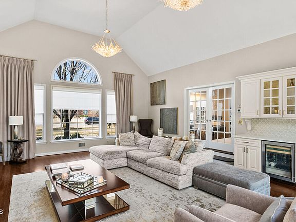 - Spacious Great Room with 15+ ft cathedral ceilings, Carrera marble fireplace, and soft-close wet bar featuring Moroccan tile and quartz countertops