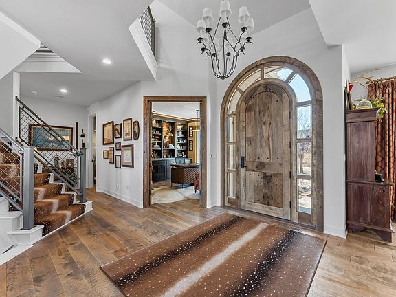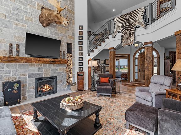Nestled in a prime location, this exceptional two-story estate seamlessly combines the bold elegance of Western American Lodge design with the stunning beauty of its natural surroundings. Every inch of this remarkable home has been meticulously crafted and thoughtfully updated to create a breathtaking living space that radiates both luxury and warmth. Upon entry, you are welcomed by a custom-built primary doorway that sets the tone for the entire home. The striking, on-site fabricated iron staircase railings and catwalk serve as an artistic focal point, blending intricate design with functionality. A majestic two-story, floor-to-ceiling fireplace adds grandeur and sophistication to the space, drawing the eye upward and creating a perfect setting for relaxation or entertaining. The home's attention to detail is evident in every room, from the new reclaimed wood flooring throughout, to the custom cabinetry, sleek countertops, and high-end appliances. Each element has been carefully chosen to complement the home's distinctive style and enhance its luxurious feel, all with the exclusive Antelope touch.