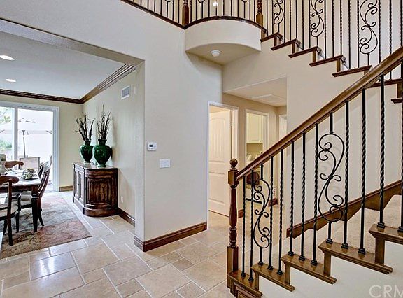 Beautiful opportunity to own this energy efficient home in the desirable 'Cornerstone' community! Step inside 2 Bristol Court which is situated on one of the largest lots in the neighborhood! Be immersed in the natural beauty of the countless upgrades to the home including Limestone flooring, plantation shutters, crown molding and upgraded baseboards. Enjoy main floor living with bedroom and full bathroom downstairs. Customized kitchen complete with granite countertops, stunning cabinetry, and steel appliances. Enjoy this private tropical backyard with gas BBQ island (gas line) with refrigerator, glass fire pit, water feature, and uplighting and paver lights showcase this minimal maintenance backyard with water drip system. Garage has EV charging plug-in upgrade and home has CATV throughout for fast internet connection. Association fees include maintenance of the front yard and community heated salt water pool and spa. No mello roos, close to shops and local freeways and toll roads while being less than 8 miles to the beach.