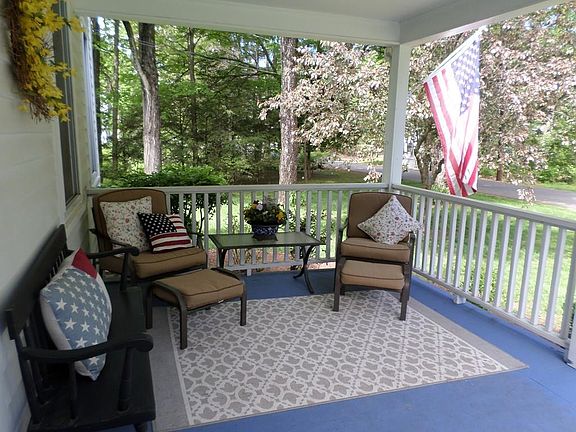 This open layout, spacious 4-bedroom farmhouse is perfect for entertaining inside and out. A MUST SEE! Updated (May 2017) hard wood floors and porches add to this Colonial's move in condition with fresh paint inside and out, new roof, new windows, updated kitchen and many modern amenities such as central air conditioning, central vacuum, expansive irrigation system that runs on spate well (town water for drinking, shower and family use), alarm system, canine invisible fence, optional laundry hook-up on the second floor and much more. The convenient center of town location allows for an easy walk to shops, library, trails, and playgrounds. The impressive 2-story garage is perfect for loads of storage and fun projects. Enjoy your privacy by relaxing on one of the three porches or the covered patio over looking almost an acre of flat land tucked away on a private lane with only 2 other homes. Top notch public and private schools.