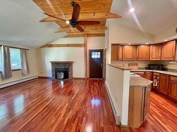 Welcome home to a quiet country lane just off the main road in desirable Rutland! Stunningly renovated pristine interior with vaulted ceiling, beams, hardwood floors, Kraftmaid cabinets with custom features, granite countertops. The open floorplan features a fireplace with pellet stove, sliders to the private back yard. 3 bedrooms and full bath. Exterior doors recently replaced, full basement is connected to the 2 car garage with second driveway. Property extends over one acre with flat, private, shady lot. Not a drive by, make your appointment today!