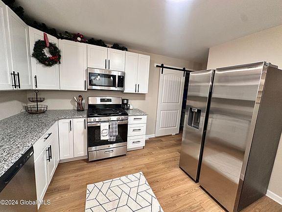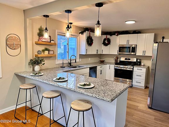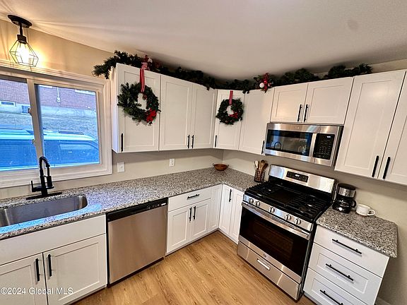 This beautifully renovated ranch home offers a perfect blend of modern charm & comfort. The open-concept design features a spacious kitchen w white shaker cabinets, stunning granite countertops, & s/s appliances, all overlooking the dining & living area w shiplap wall. Three generous bedrooms w hardwood floors provide plenty of space & natural light. Enjoy the completely finished basement with half bathroom, family room, workout room & plenty of additional storage. Laundry hookups on 1st floor & in bsmt. Situated in a lovely development/walk to park, the home includes a three season room with new rubber roof installed 12/24, one-car garage & a fenced backyard. Must See!