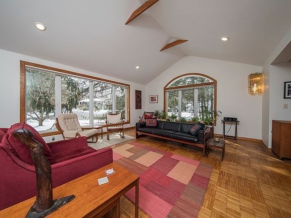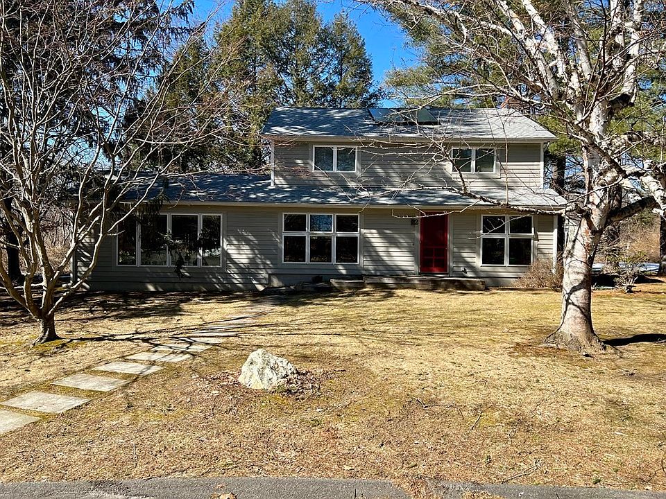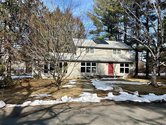 The property has had the same owners for 52+ years, and pride of ownership is apparent along with numerous updates. This hard-to-find location is just a short walk to Puffers Pond, Mill River Recreational facility, and conservation trails. You are tucked within a quiet cul de sac with 3 other houses. With nature as your neighbor, you will love the pond's serenity and soothing waterfall. Inside finds a cozy fireplace den with an adjacent office. Highly sought-after first-floor open updated kitchen with butcherblock island that leads to the light-filled dining room. The spacious step-down living room with a vaulted ceiling, large windows, parquet wood floors, and a piano nook is stunning. The first-floor full bath has been updated with age-in-place fixtures. There are four additional HW floor bedrooms and a second shared full bathroom upstairs. See this exceptional home in the culturally rich Five College area with sought-after public schools—solar hot water
