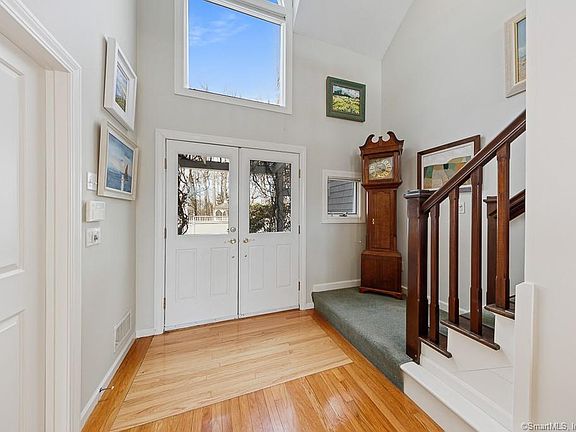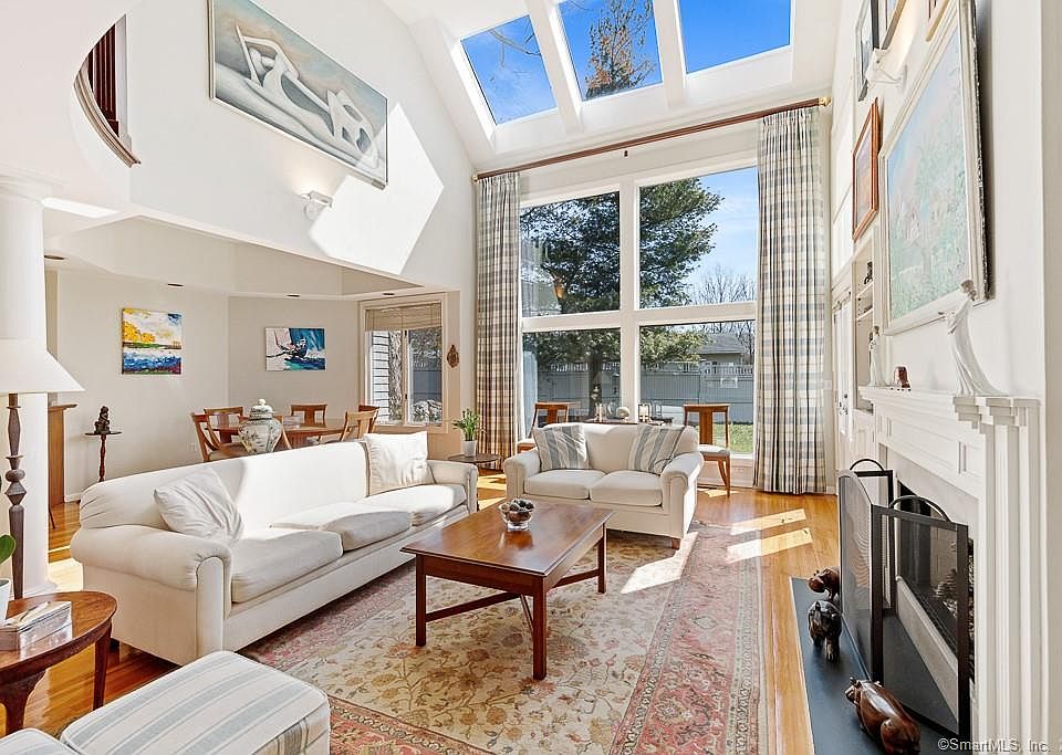 Tucked away on a private cul de sac, yet minutes from everything Westport offers, this elegant, sun-drenched home has it all. The heart of the home is the dramatic double-height living room with gas fireplace & floor-to-ceiling windows leading to dining area. A breakfast bar separates the kitchen with its sleek counters & stainless steel appliances, including a new gas cooktop & dishwasher & handy planning desk. An expanded breakfast nook with French doors leads to a sunny patio, convenient for grilling or entertaining. The ground-floor primary bedroom suite is spacious with marble shower, soaking tub & walk-in closet. A regal ground floor office with mahogany coffered ceiling & extensive built-ins has French doors leading to a second patio, also accessible from the living room. A laundry room, pantry, powder room & 2-car garage access complete the ground floor. Upstairs, the family room features vaulted ceiling, beams & skylights, plus a kitchen nook with mini-fridge & dishwaher. The large adjacent bedroom features more skylights & plenty of storage, plus an updated full bath. This suite has its own outside access, creating a private area for long/short-term guests. Two further bedrooms, one with built-ins & skylights, share a hall bath. A mahogany reading nook overlooks the dramatic living room. Enjoy the trifecta of city water, sewer & natural gas. The home is walkable to Terrain & Trader Joes & a short drive to beaches, shopping & NYC train.