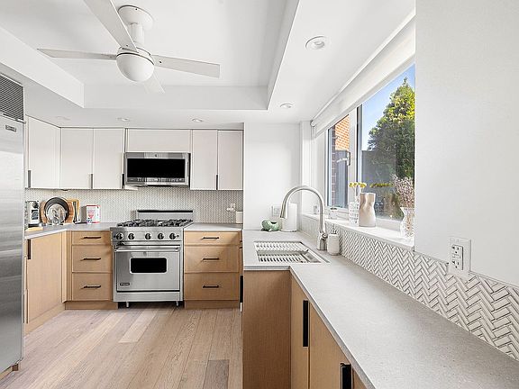 The chef’s kitchen is as functional as it is beautiful. Bathed in natural light thought the day, it features tons of prep space with Porcelanosa countertops, an Ann Sacks ceramic herringbone backsplash, and top-of-the-line appliances including a Viking range, Sub-Zero refrigerator, and Miele dishwasher.