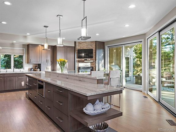 You will not want to miss this opportunity to make this home your dream. With its beautiful hardwoods throughout the main floor and an abundance of natural light streaming in through skylights and walls of windows, this home exudes warmth, comfort, and elegance. The chef’s kitchen is a culinary dream with its top-of-the-line Thermador appliances, beautiful stone countertops and a custom built-in breakfast nook with additional counter space. It’s the perfect spot for entertaining friends and enjoying family. Situated on a generous one-acre lot, this property features a lush and serene setting ideal for outdoor activity or relaxing amid a mountain backdrop. The quiet country road winding up to #2 Cherry Lane Drive highlights the peaceful ambience of this neighborhood. With a four-car garage, there is terrific room for most vehicles and excellent storage. The finished basement offers a workout room and an additional bedroom suite with bathroom. The generously sized recreation and TV space is a perfect hanging-out area, with a pool table adjacent to the wet bar and beverage station. The main floor primary bedroom is the epitome of luxury. Enter this private sanctuary and appreciate the professionally designed walk-in closet and special five-piece bathroom, including beautiful steam shower. Step outside your bedroom and begin your morning with your favorite cup of coffee on the patio overlooking the gorgeous and secluded outdoor setting. The second-floor bedroom space is simply delightful and unique, with three generous bedroom suites, complete with fabulous bathrooms and walk-in closets. The icing on the cake is the upstairs lounge area, ideally situated between the bedrooms with soaring windows and a variety of built-in conveniences. This home provides easy access to shops,restaurants, and other convenient services, while offering a coveted and tranquil home environment. Colorado Boulevard, Hampden Avenue and I-25 are several minutes away.