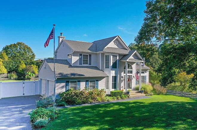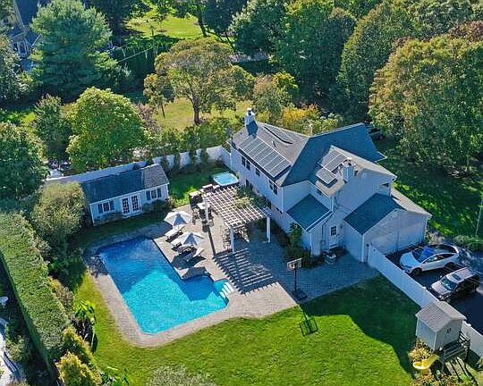 Set on almost 3/4 of an acre & offering many modern-day amenities including, 11 kWp Solar Edge Solar system. The vaulted entrance leads to an open floor plan living room with cast iron wood burning stove. The kitchen boasts energy star efficient stainless-steel appliances and eating area. The formal dining room is spacious for entertaining. There is also a mud room/laundry room, half bath & den showcasing another wood burning fireplace, and a sliding glass door that opens out to the oasis like rear yard. The second floor features 4 generously sized bedrooms including an en-suite master with additional bathroom with steam shower. This floor also includes another full bathroom and additional enclosed washer and dryer. Outdoors enjoy relaxing by heated pool & 6 person hot tub. Entertain under the custom-made pergola and sit by the firepit. The attached 2 car garage includes EV hookup. The legal finished basement offers a gym area, one-bedroom living with walk out access to exterior. Located in Remsenburg School district with extremely low taxes $4,124, also has oversized pool house/shed.